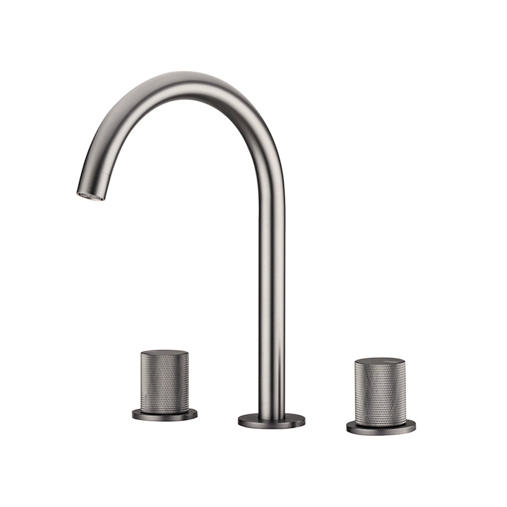 Widespread faucet round design. The Knurled collection of harmonious aesthetics that decorates the bathroom space with defined rounded lines that adapt to the urban style. A simple piece in compact form that incorporates refined finishes and knurled handles that make this work an exclusive faucet. Its innovative knurling lever design improves the functionality of continuous use. A piece of timeless as a proposal for the current bathrooms. Manufactured in brass will make your product stand the test of time like the first day.Available in different finishes.