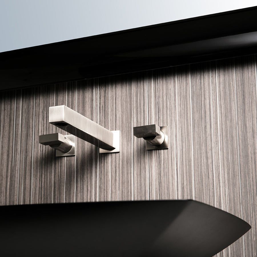 Modern sink faucet wall mount widespread 8 inch with flat handles. Manufactured in brass and with ceramic cartridges that provide long life to the product. Resistant to corrosion will last for years. Complete the installation of your bathroom with the Cubic or Luk 2 accessory family. Available in different finishes.