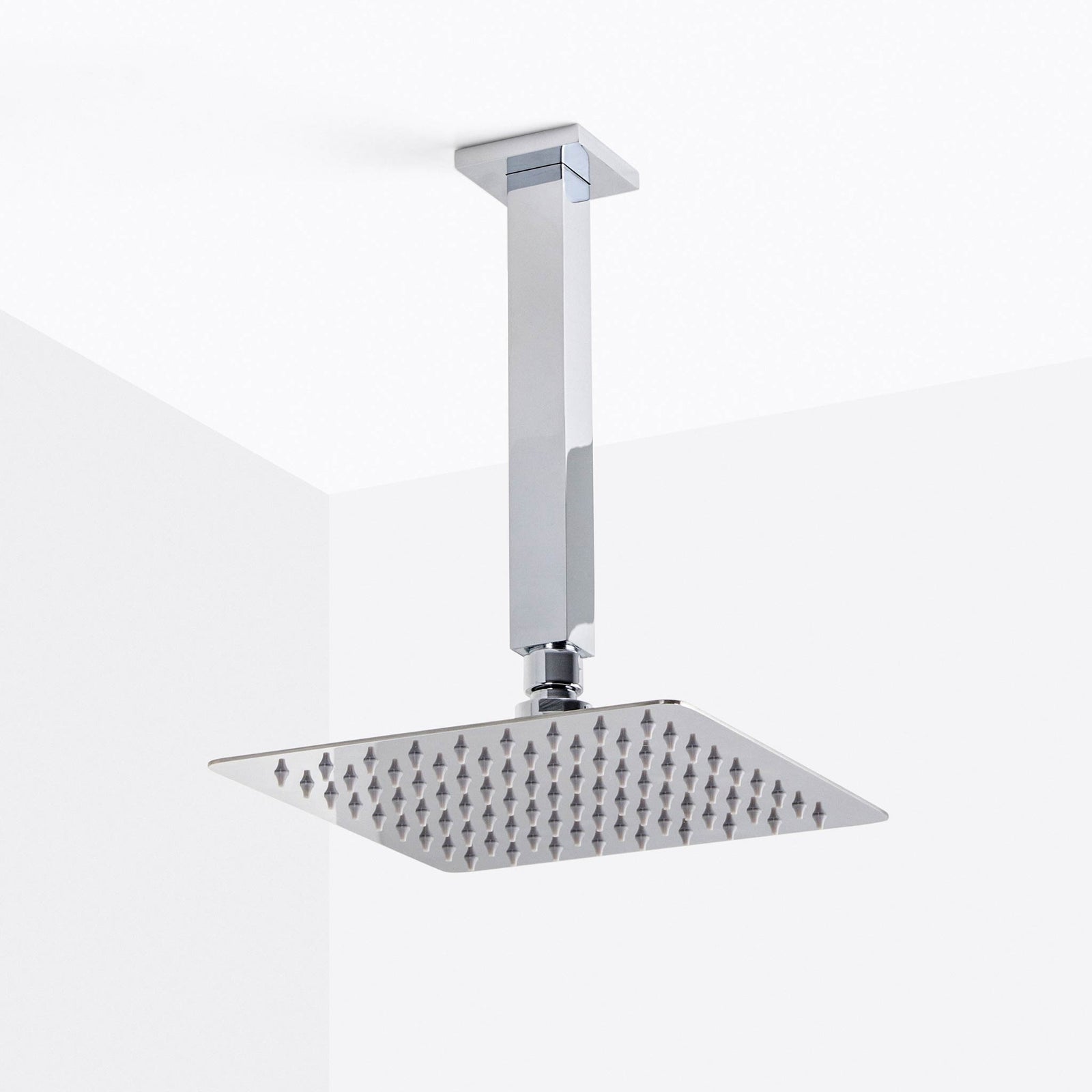 - Square design with swivel holder for hand shower.